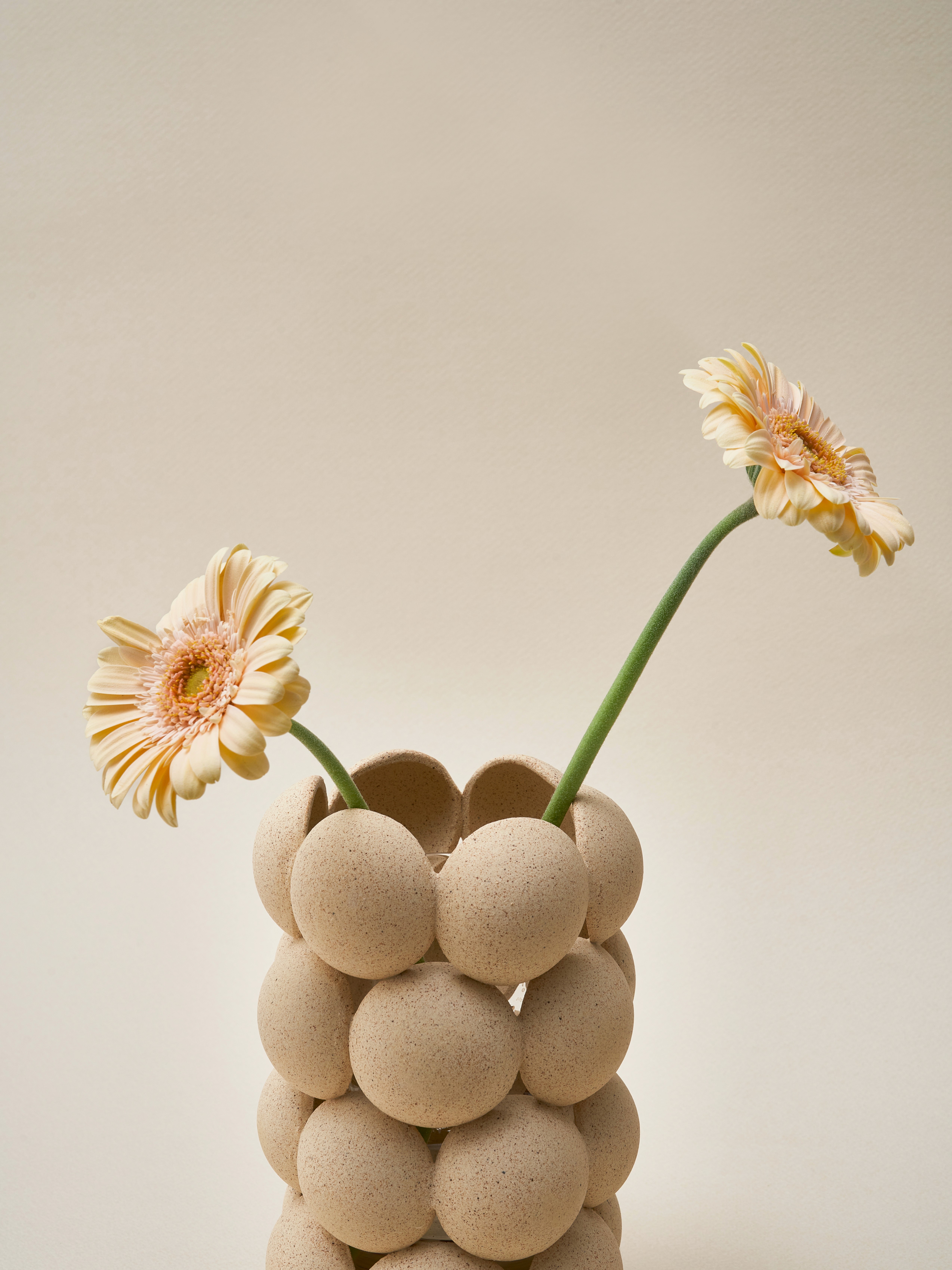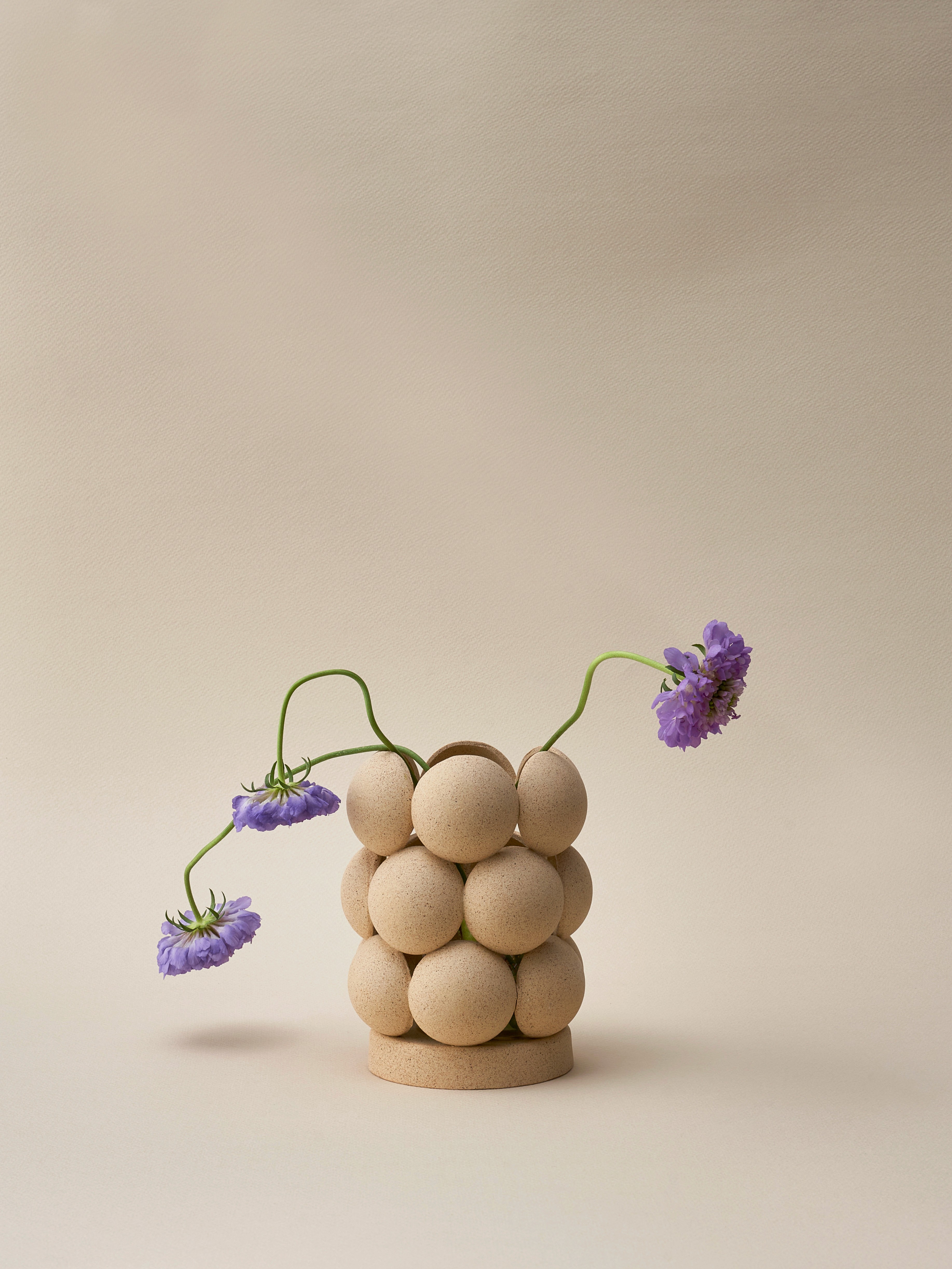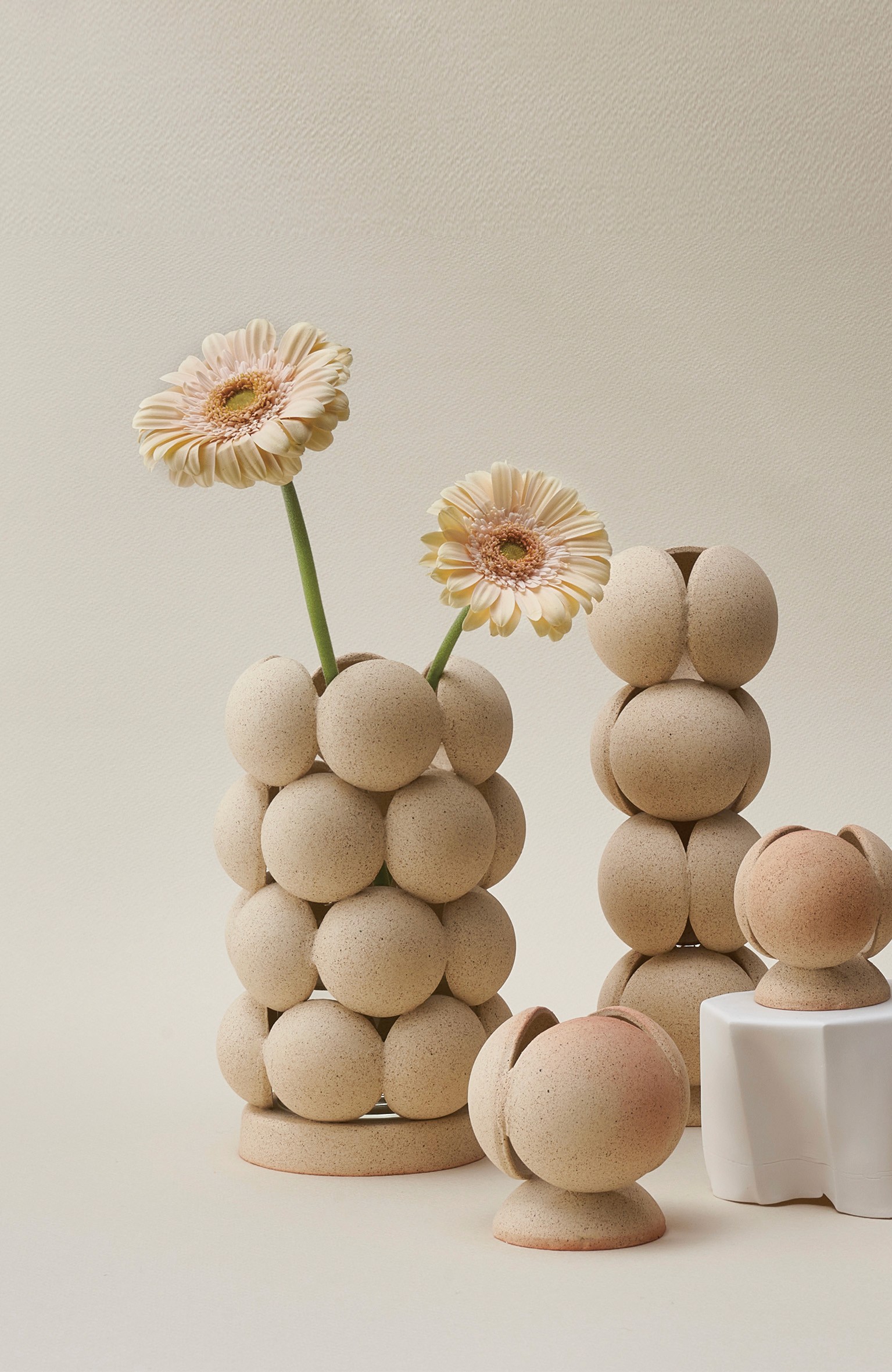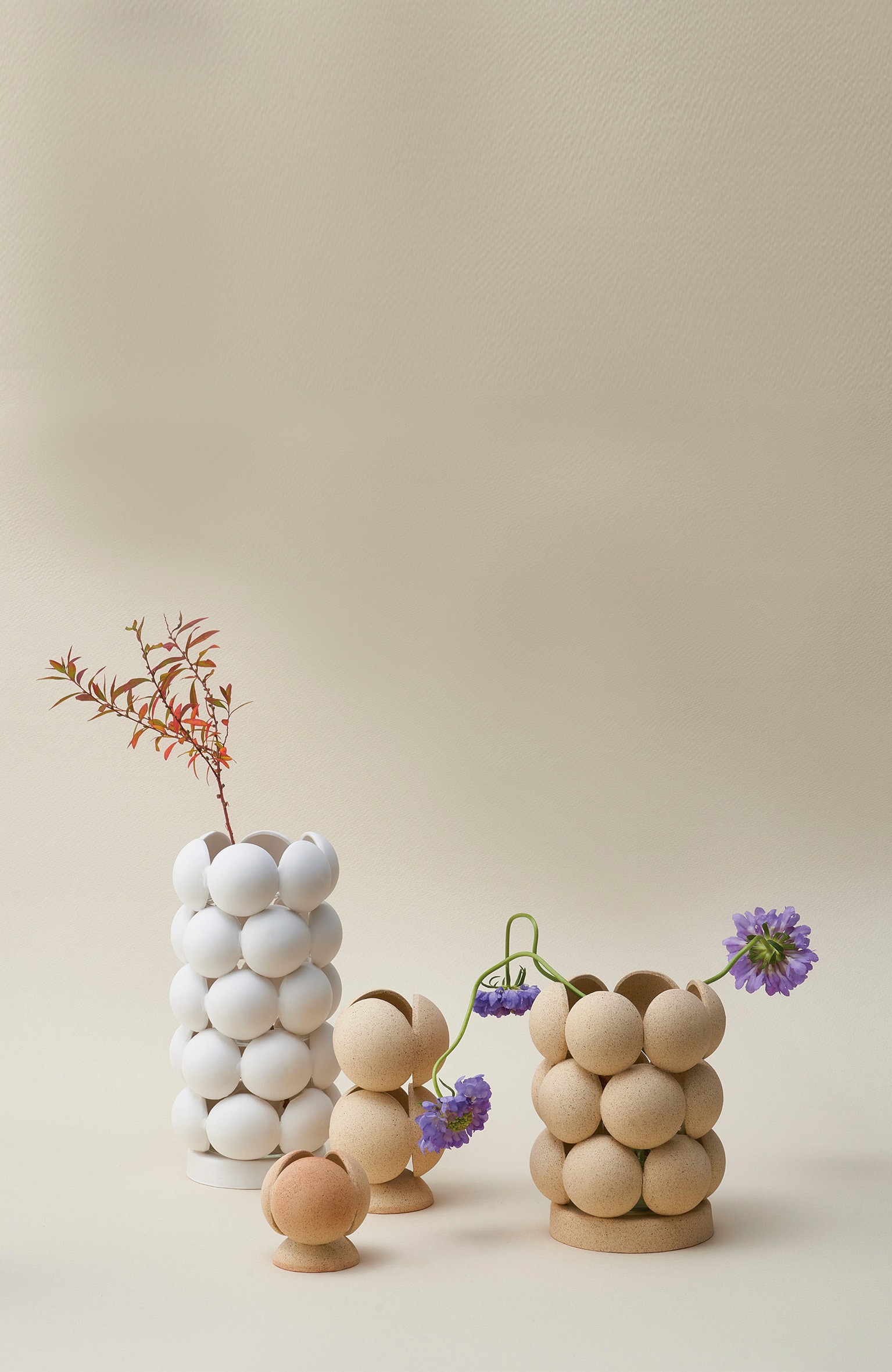 원초적인 형태를 강조하고 싶어 유리질을 입히지 않은 소지의 자연스러운 질감을 그대로 드러내고, 서로를 연결하는 과정을 거쳐 고온에서도 무너지지 않게 견고해진 원형들의 단정한 곡선을 담아냈습니다.