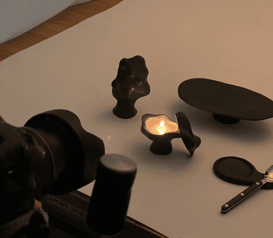 하루를 마무리하는 시간에 식탁을 둘러싼 작은 소란과 짙은 분위기를 떠올리며, 그 감정을 테이블 위에서 사용할 수 있는 형태-주전자와 다과를 위한 플레이트, 빛과 향을 위한 것들 로 풀어냈습니다.