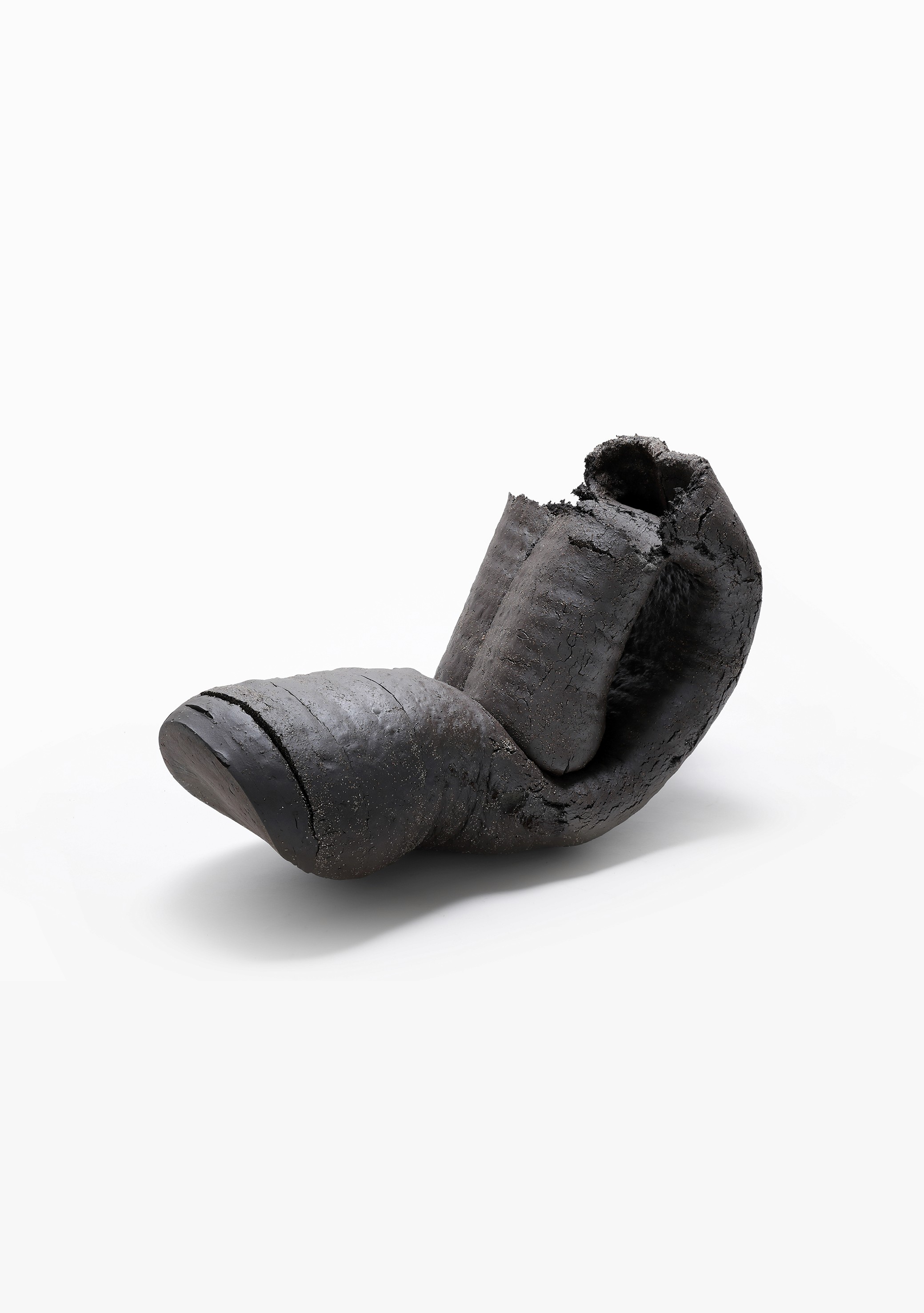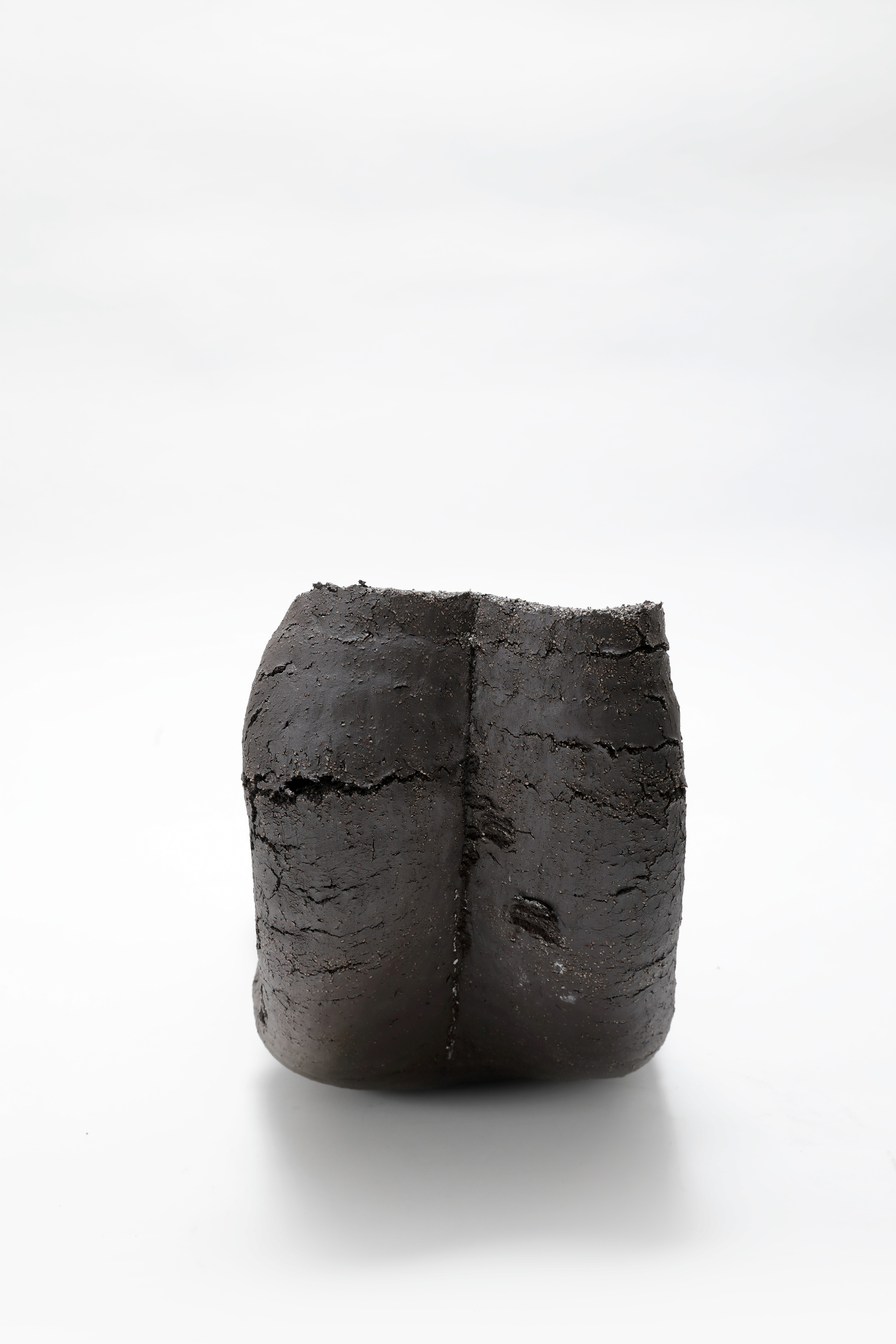 거친 흙가래를 쌓아올려 소성을 하던 중 소성권장 온도를 넘어가 불의 힘을 버티지 못 하고 조형이 무너졌는데, 우연하게도 다른 기물들을 피해 스스로만 무너져 형태를 갖추었습니다. 쌓아올린 흔적이 보이는 갈라짐과